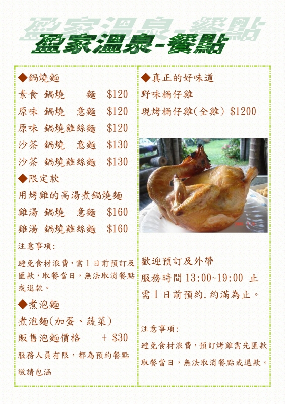避免食材浪費、1日前預約。煮泡麵類,當日預約即可。老闆身兼多職,請體諒。